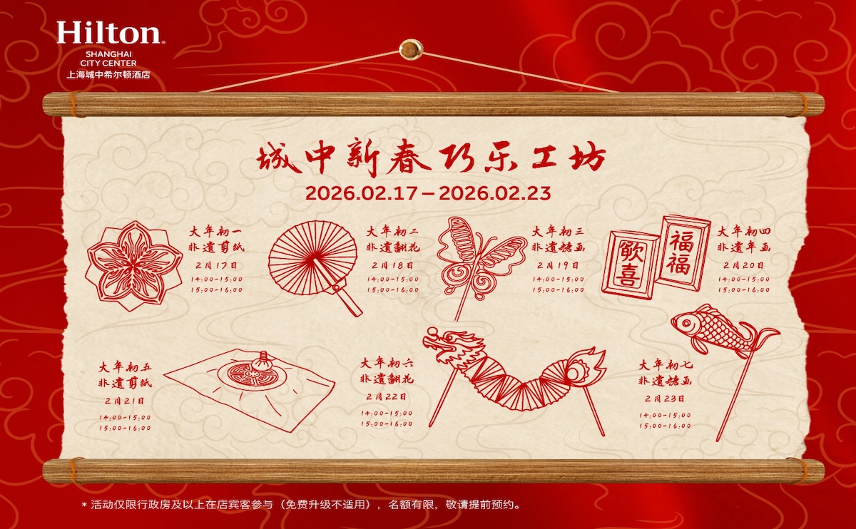 25層行政酒廊:圓弧型設計帶來開闊視野,可俯瞰延安高架及城市天際線;提供特色早餐、精致下午茶、歡樂時光,以及每次入住享 2件衣物免費普通熨燙服務。春節限時活動(需提前預約):2026年2月17日至2月23日(大年初一至初七),每日14:00–16:00兩場非遺手作體驗(剪紙、翻花、糖畫、年畫等),每場限 10位賓客。