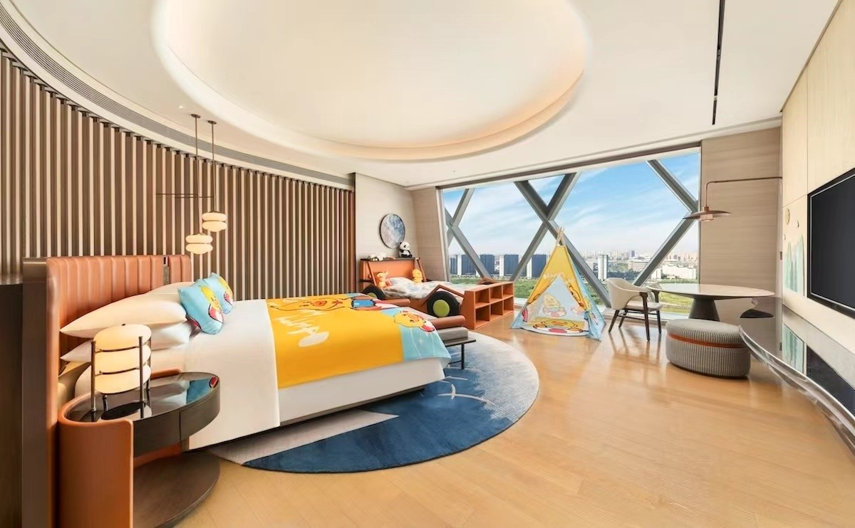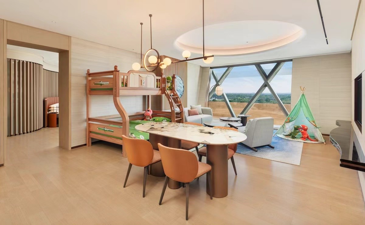 135平米,1室1厅格局,1.8*2米舒适床垫,外加可爱儿童主题单人床(蓝色海洋/暖暖粉窝主题随机安排)以及宽大的沙发区,瑰珀翠品牌洗护用品,65寸液晶电视,多种枕头安睡之选,享受避世水乡的悠扬与惬意